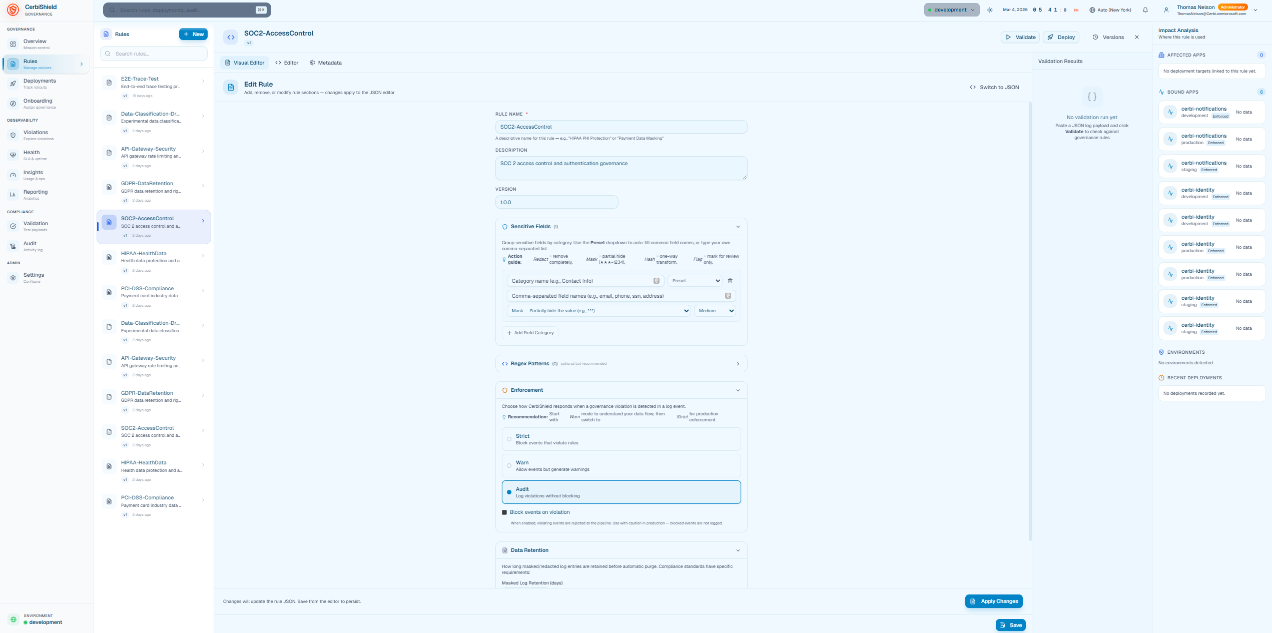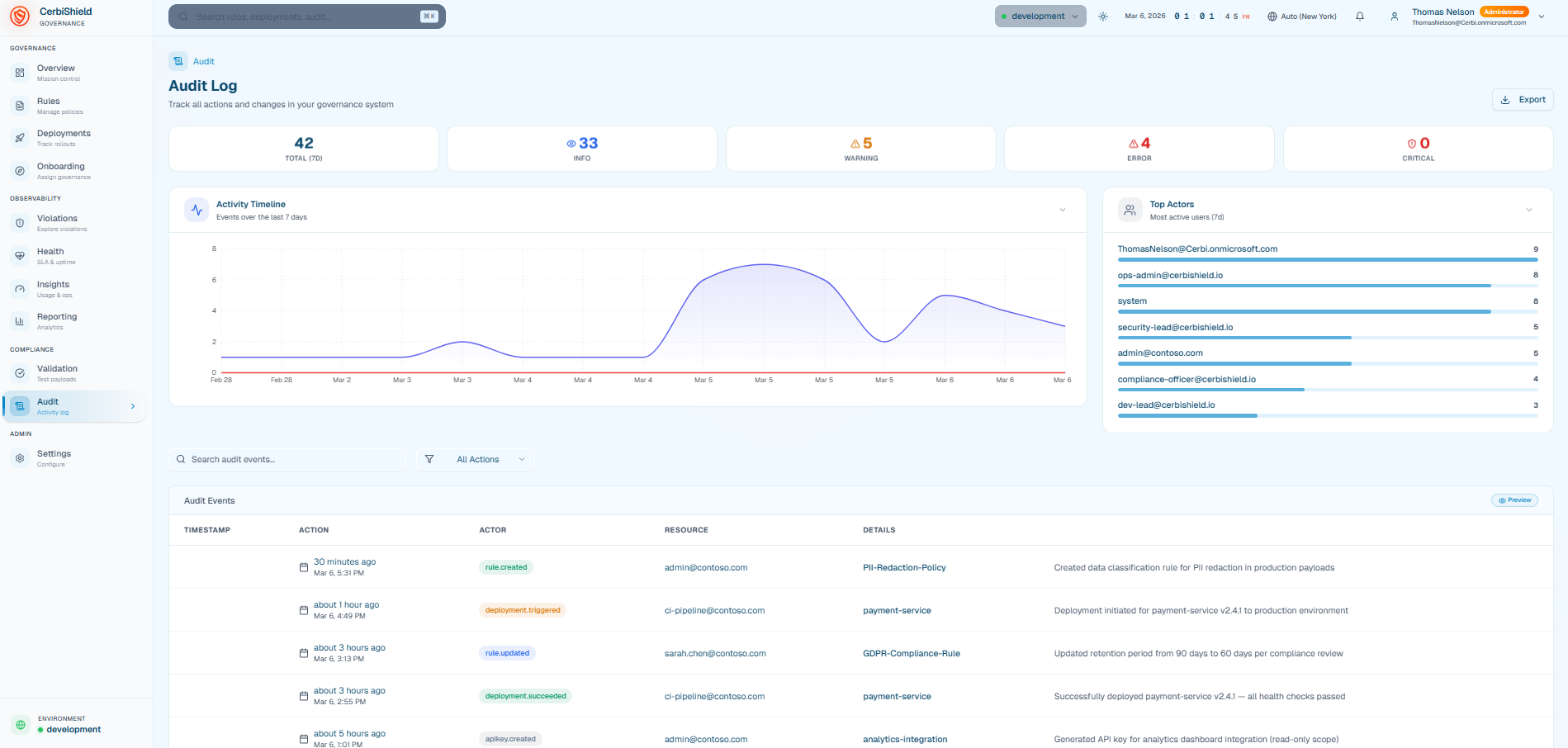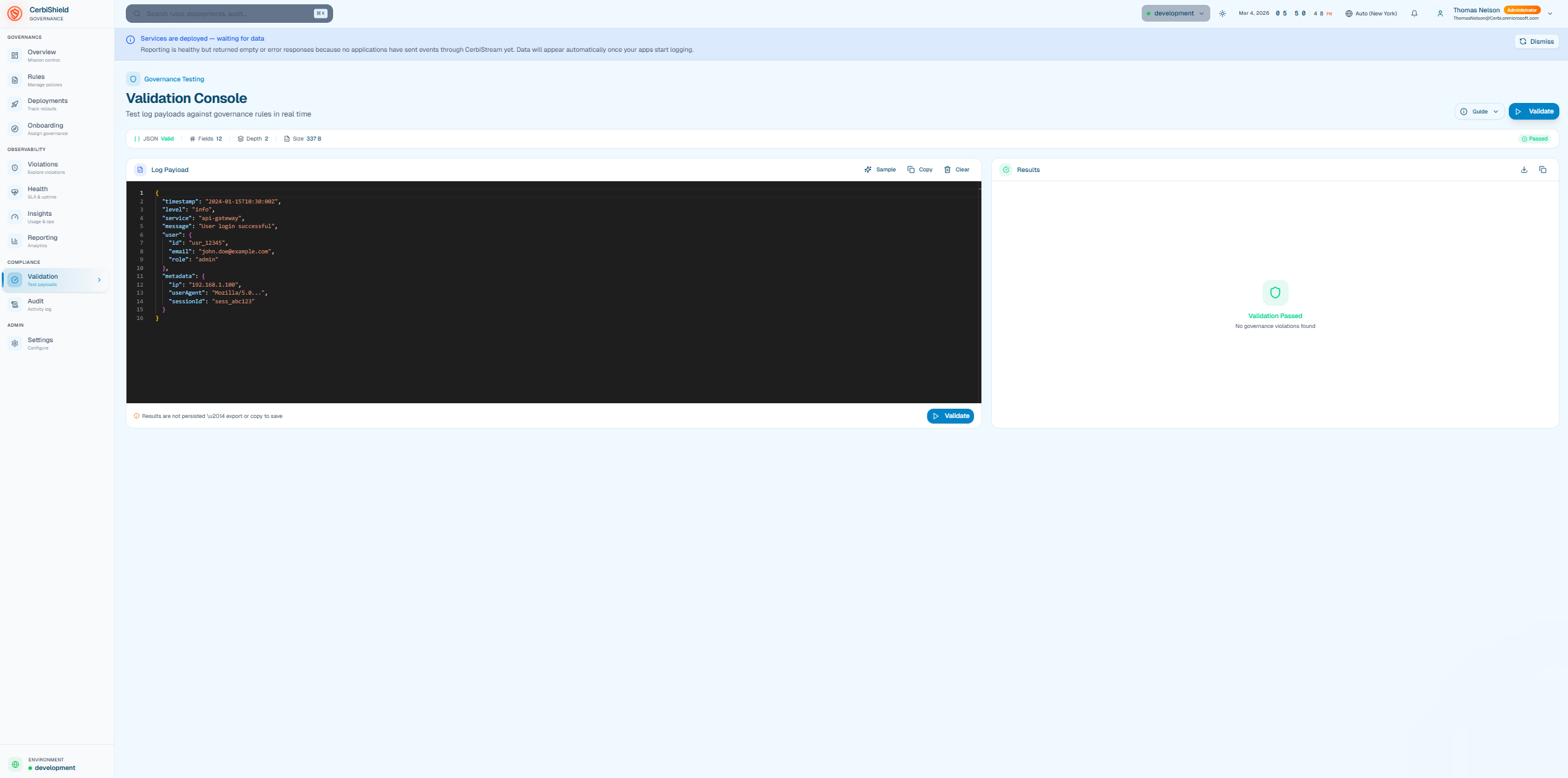 CerbiShield is the governance control plane that manages rules, policies, and audit visibility across all environments. It provides centralized configuration and analytics for telemetry governance.