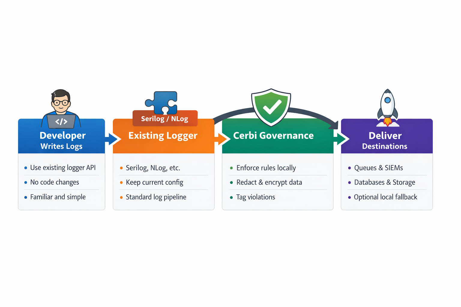 Governance only works if it shows up where logs are actually written. CerbiShield integrates directly with existing logging frameworks. No forks, no rewrites, no new logging APIs to learn.